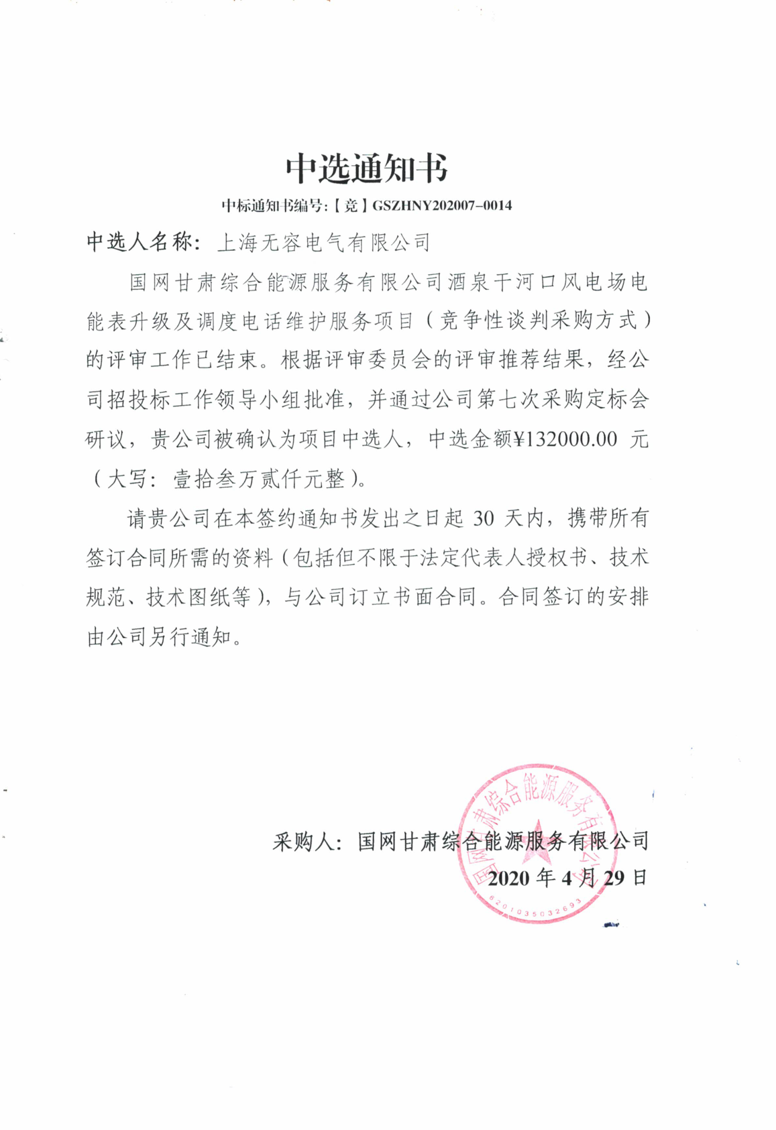 甘肃中标通知书