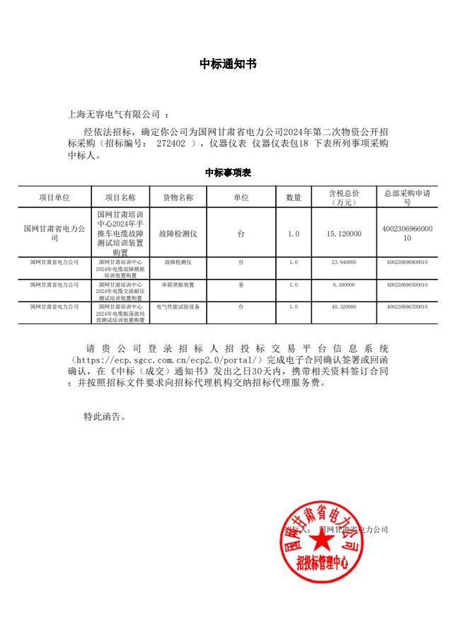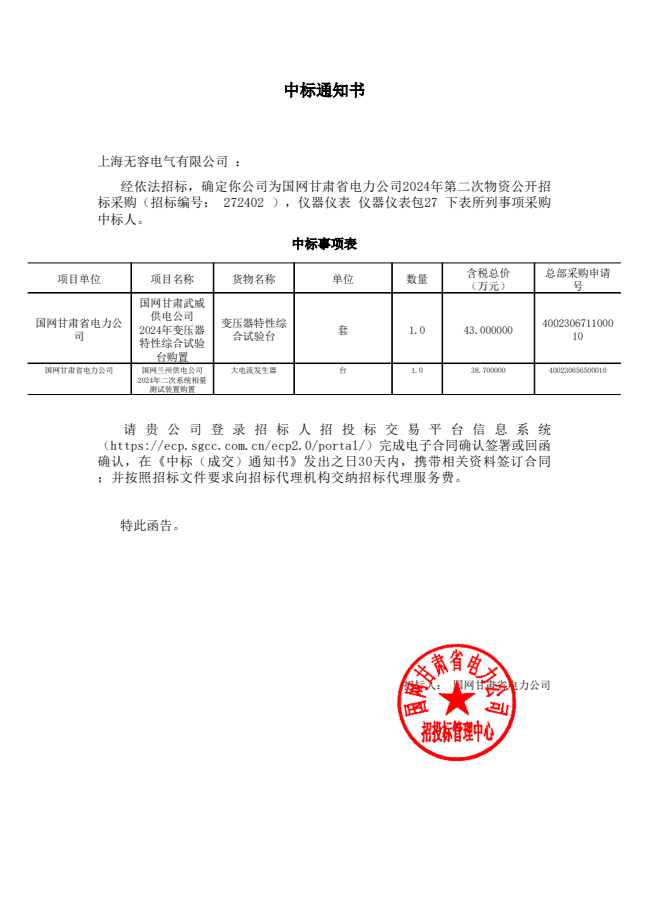 甘肃中标通知书